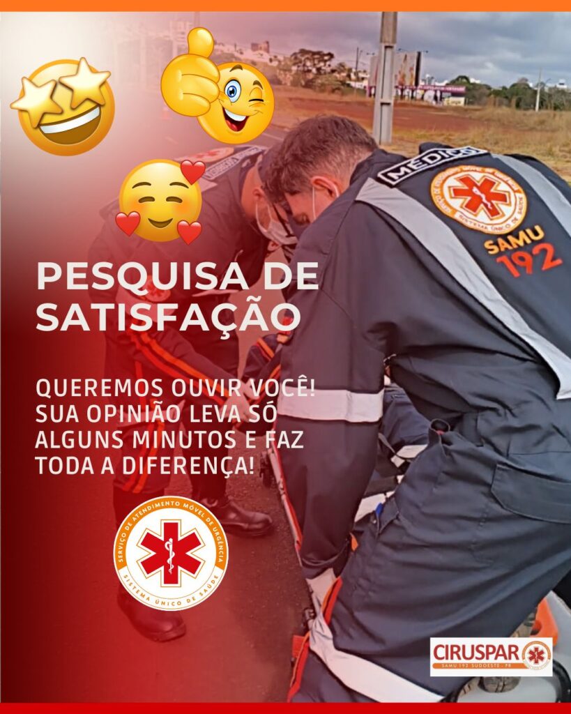 Há quase 13 anos, o SAMU 192 está ao lado de quem mais precisa e agora queremos ouvir você! Desde 2013, quando o 192 passou a atender os 42 municípios do Sudoeste do Paraná, milhares de pessoas já contaram com nossas equipes nos momentos mais urgentes da vida. Mas hoje, quem está no centro do chamado é a sua voz. Queremos saber o que você pensa sobre o SAMU 192 Sudoeste do Paraná: